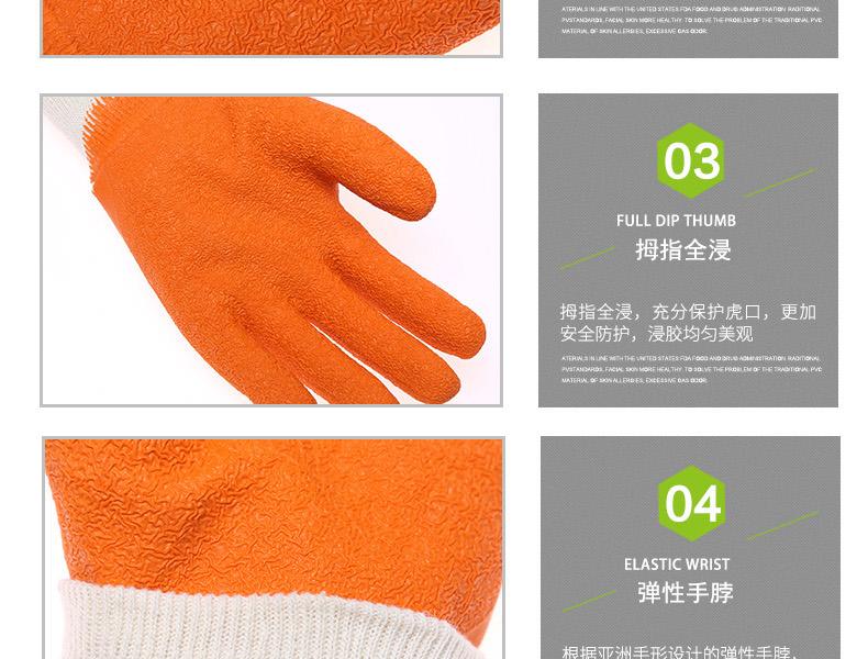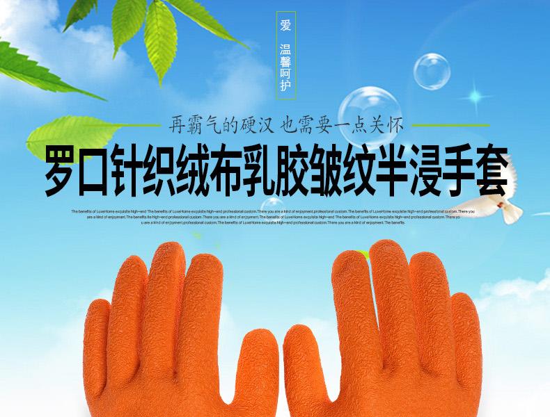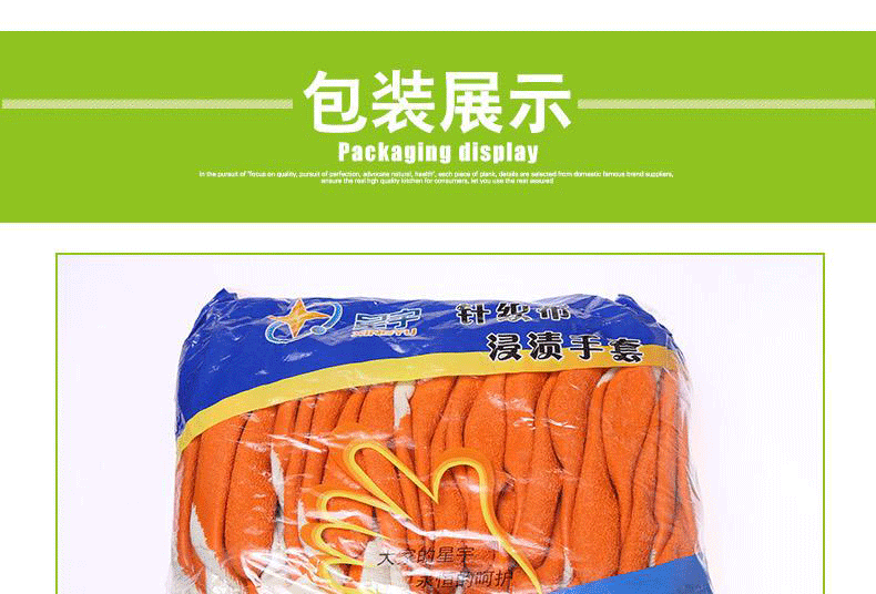 星宇L608乳膠皺紋半浸勞保手套針織布,天然乳膠。輕巧靈敏,柔軟舒適,良好的耐磨損性能;拇指全浸,充分保護虎口,更加安全防護;彈性手脖,精致鎖邊,伸展度佳,佩戴舒適。